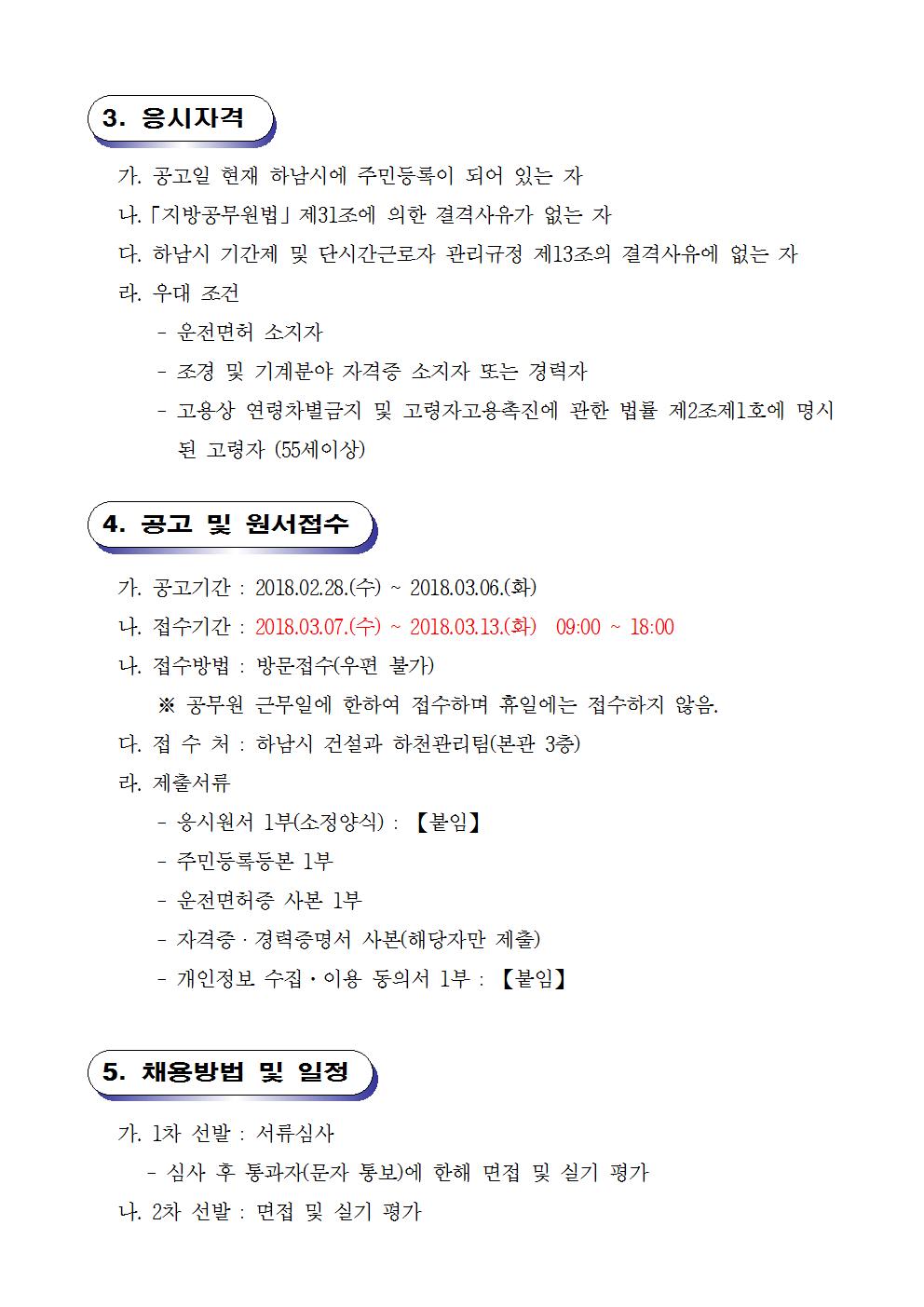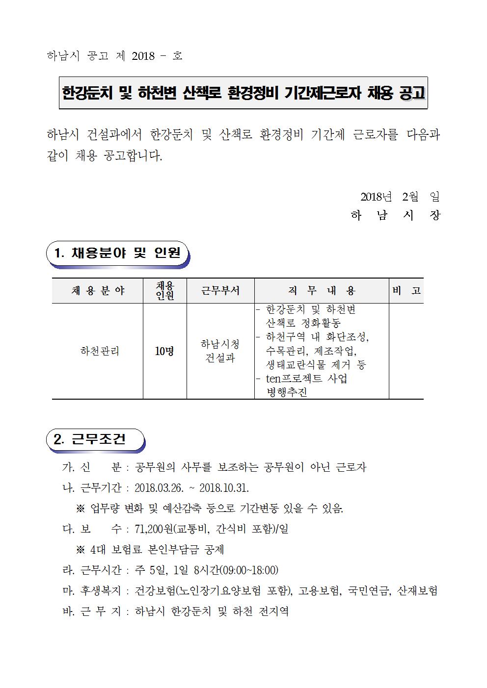 한강둔치 및 하천변 산책로 환경정비를 실시하여 하천 이용시민에게 쾌적한 환경을 제공코자 기간제근로자를 모집공고하오니 많은 지원바랍니다.