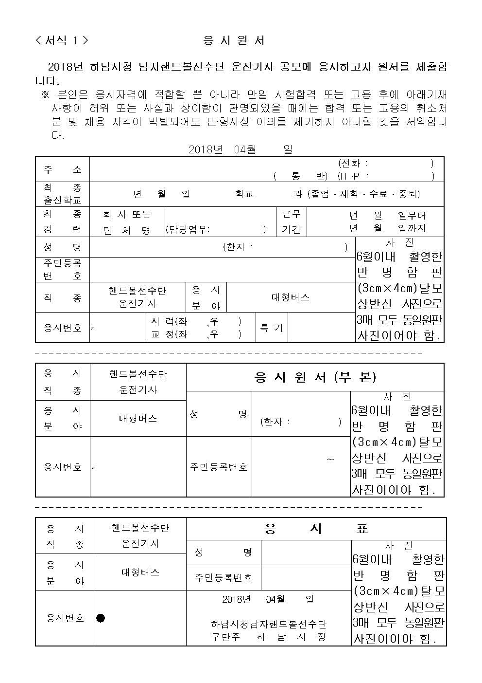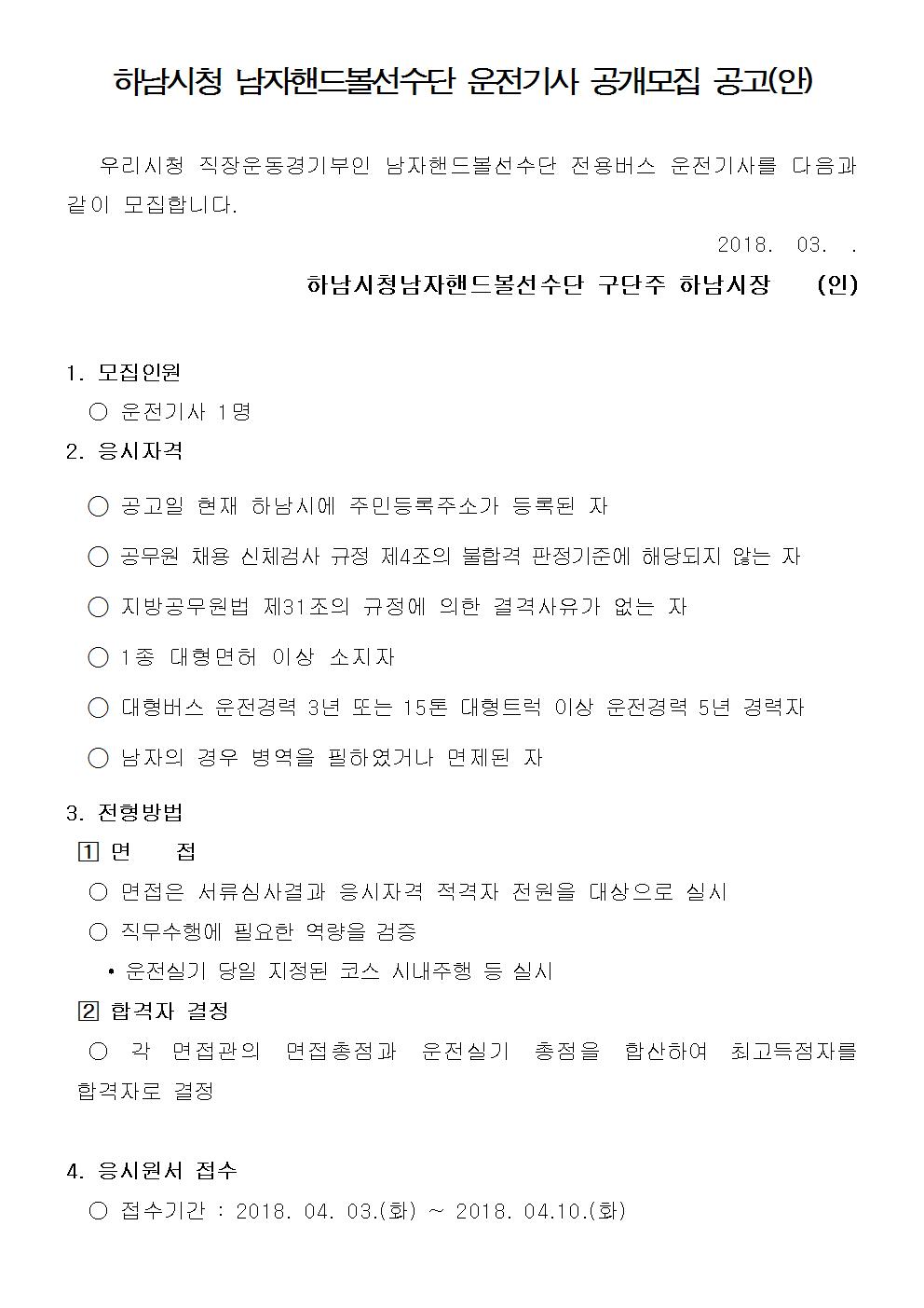 붙임 하남시청 남자핸드볼선수단 전용버스기사 공개모집 공고 1부. 끝.