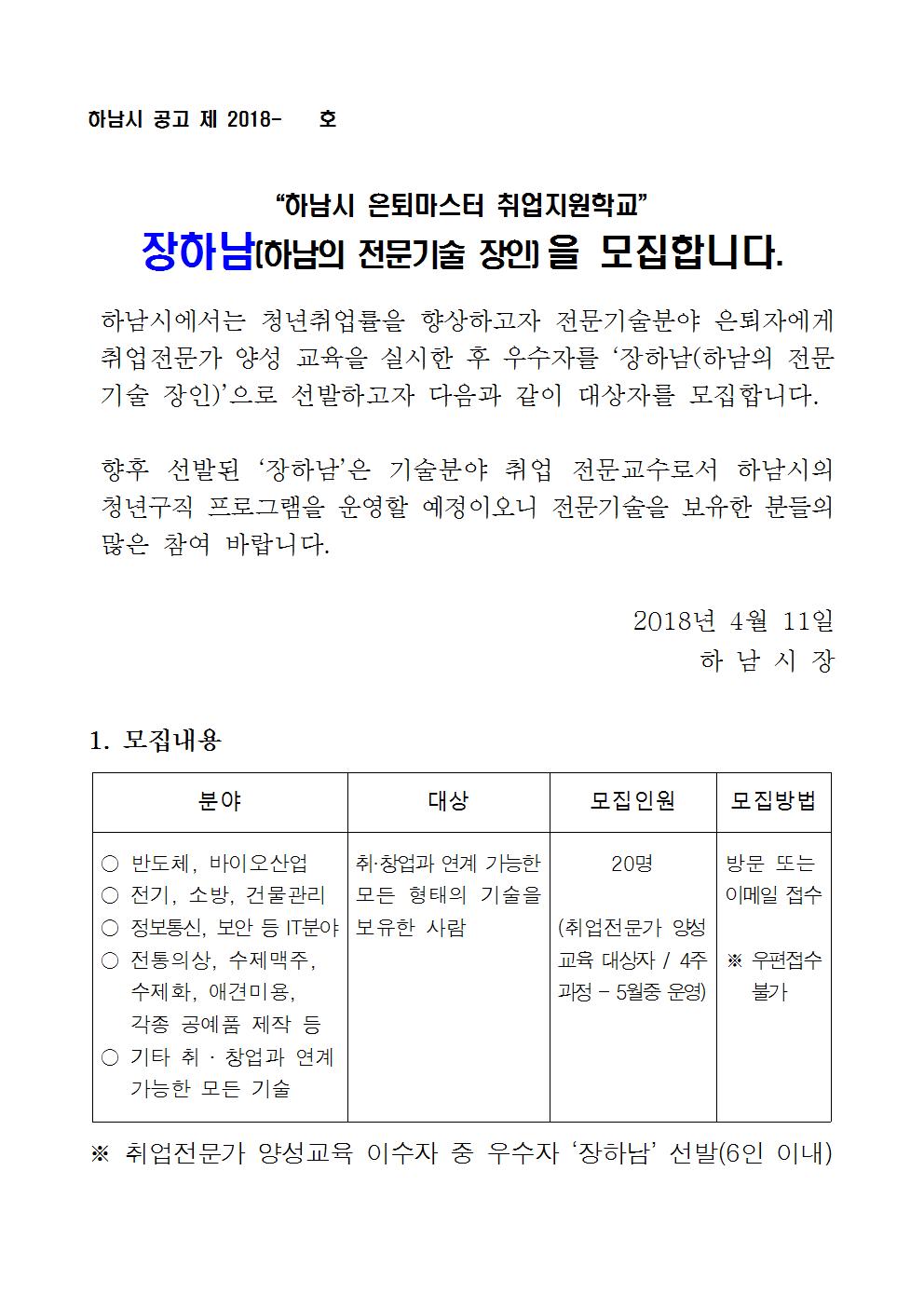 1. 하남시에서는 청년취업률을 향상하고자 전문기술분야 은퇴자에게 취업전문가 양성 교육을 실시한 후 우수자를 '장하남(하남의 전문기술 장인)'으로 선발하고자 붙임 공고문과 같이 대상자를 모집합니다.