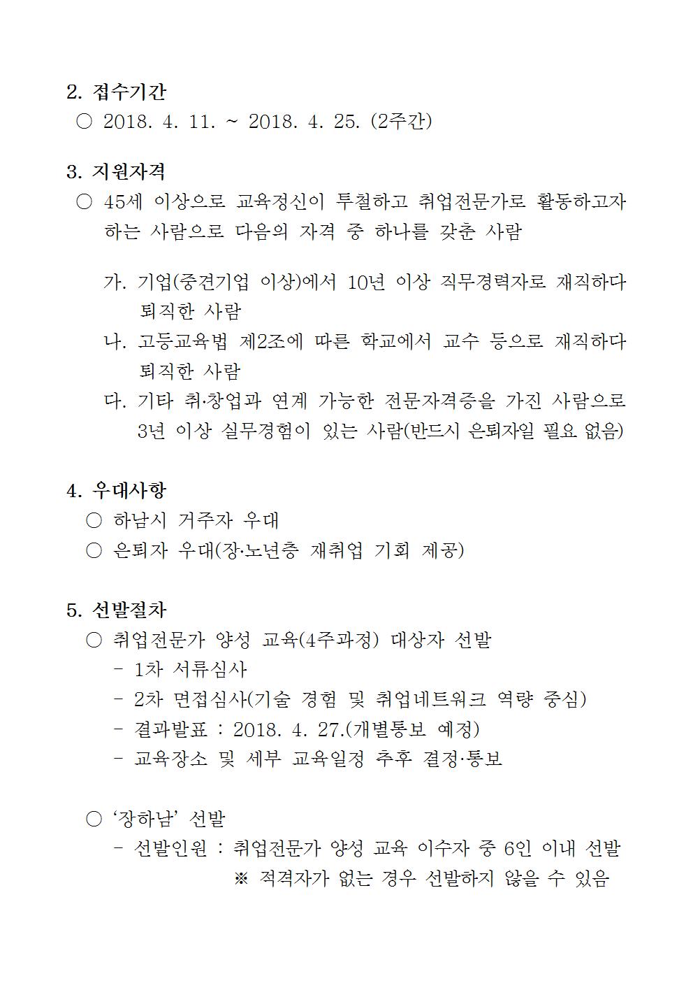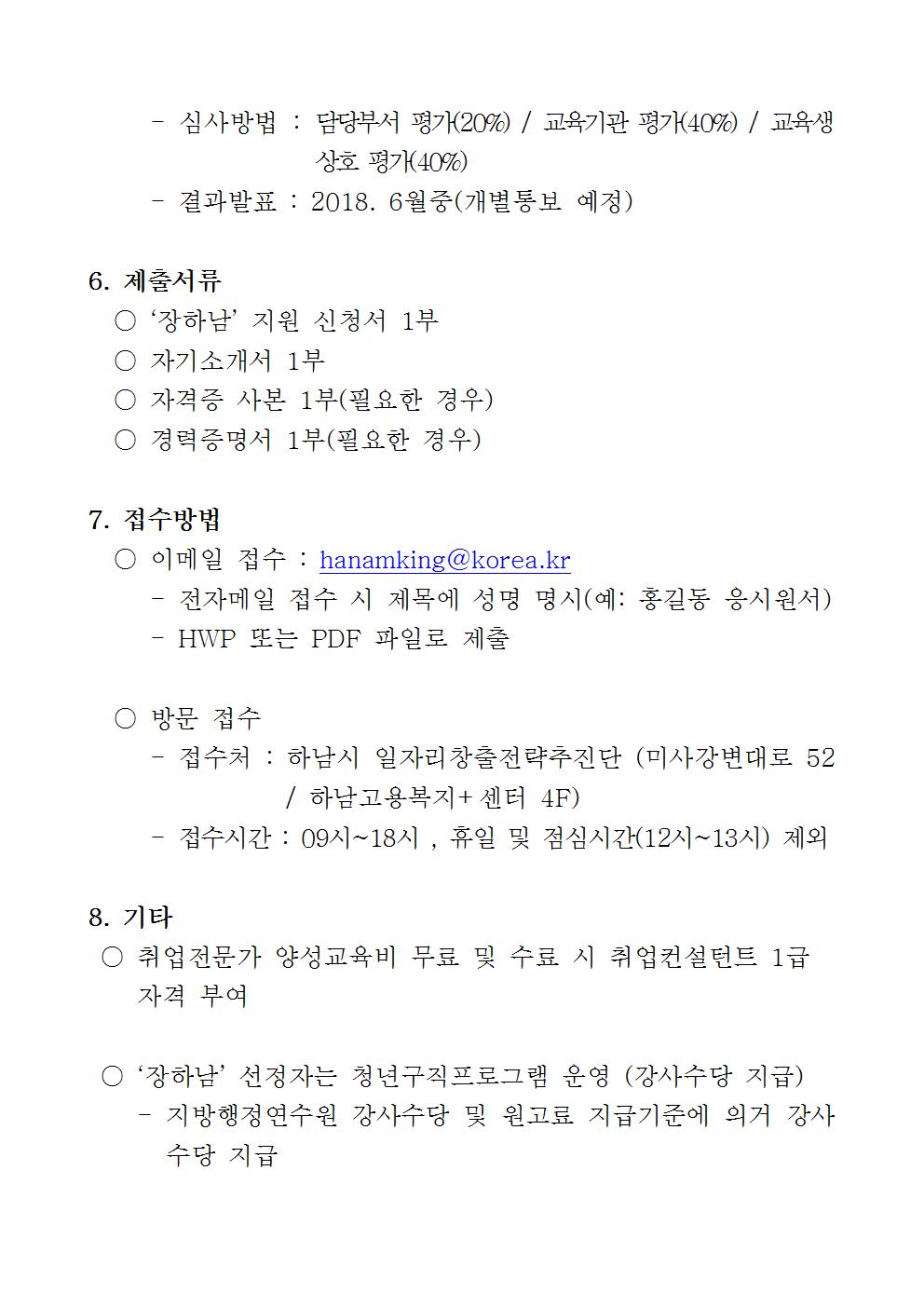 2. 향후 선발된 '장하남'은 기술분야 취업 전문교수로서 하남시의 청년구직 프로그램을 운영할 예정이오니 전문기술을 보유한 분들의 많은 참여 바랍니다.