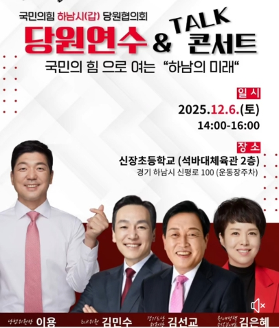 국민의힘 이용 하남갑당협위원장은 6일 오후 2시~4시, 신장초교 석바대체육관 2층에서 <당원연수 & 토크콘서트>를 개최한다,.
